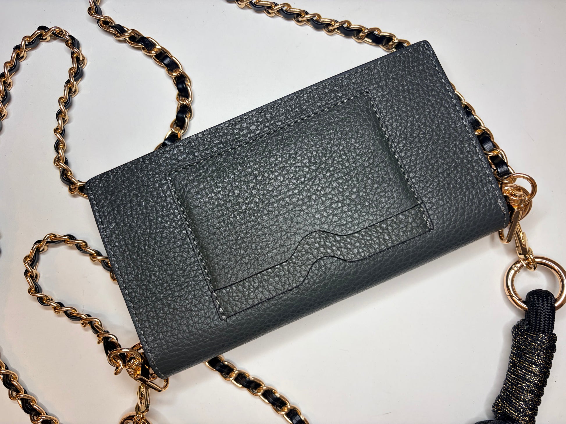 This mini mobile bag is Made of cow leather, has a magnetic closure and a cards holder on the back side.