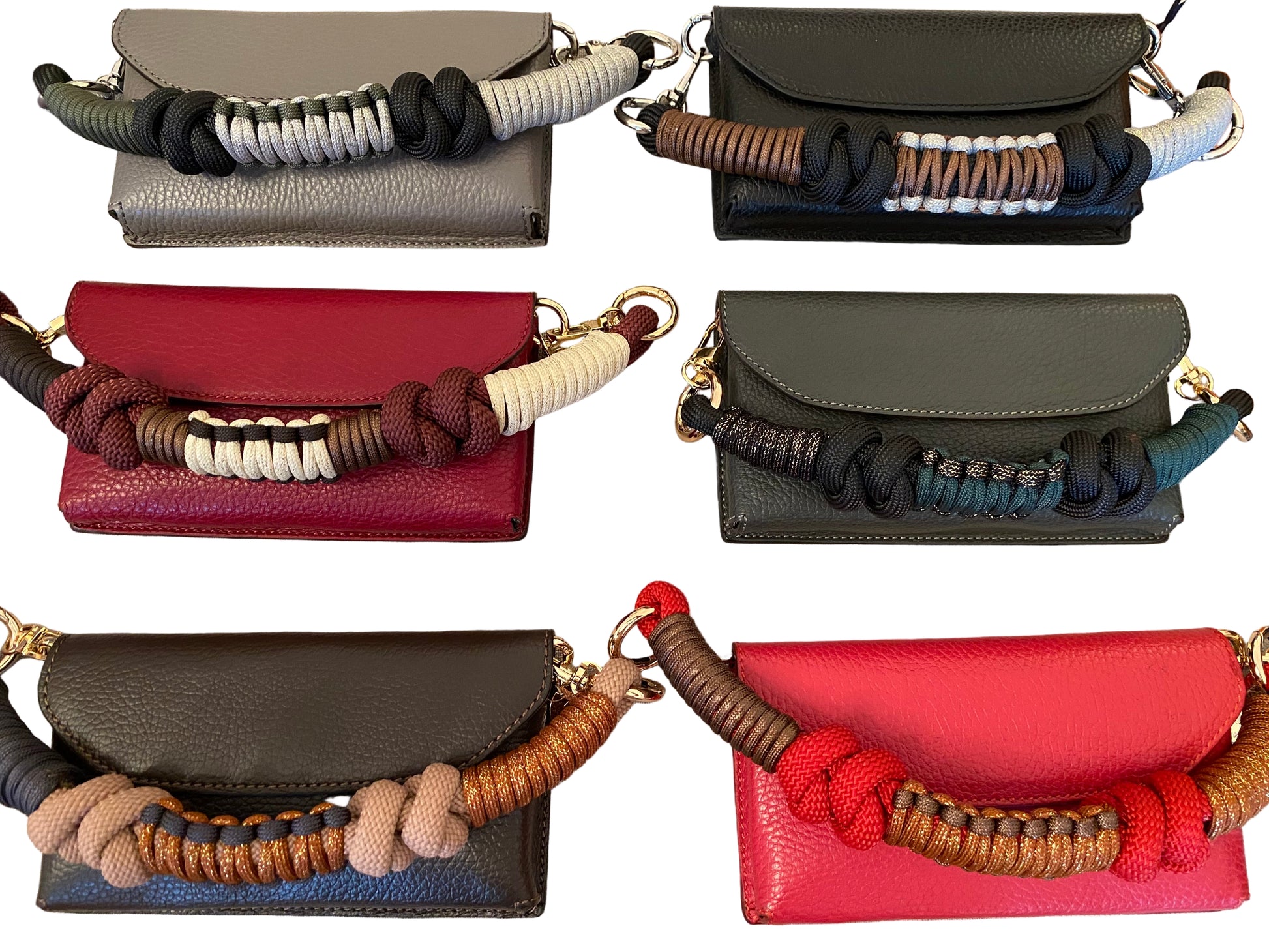 This mini mobile bag is Made of cow leather, has a magnetic closure and a cards holder on the back side.