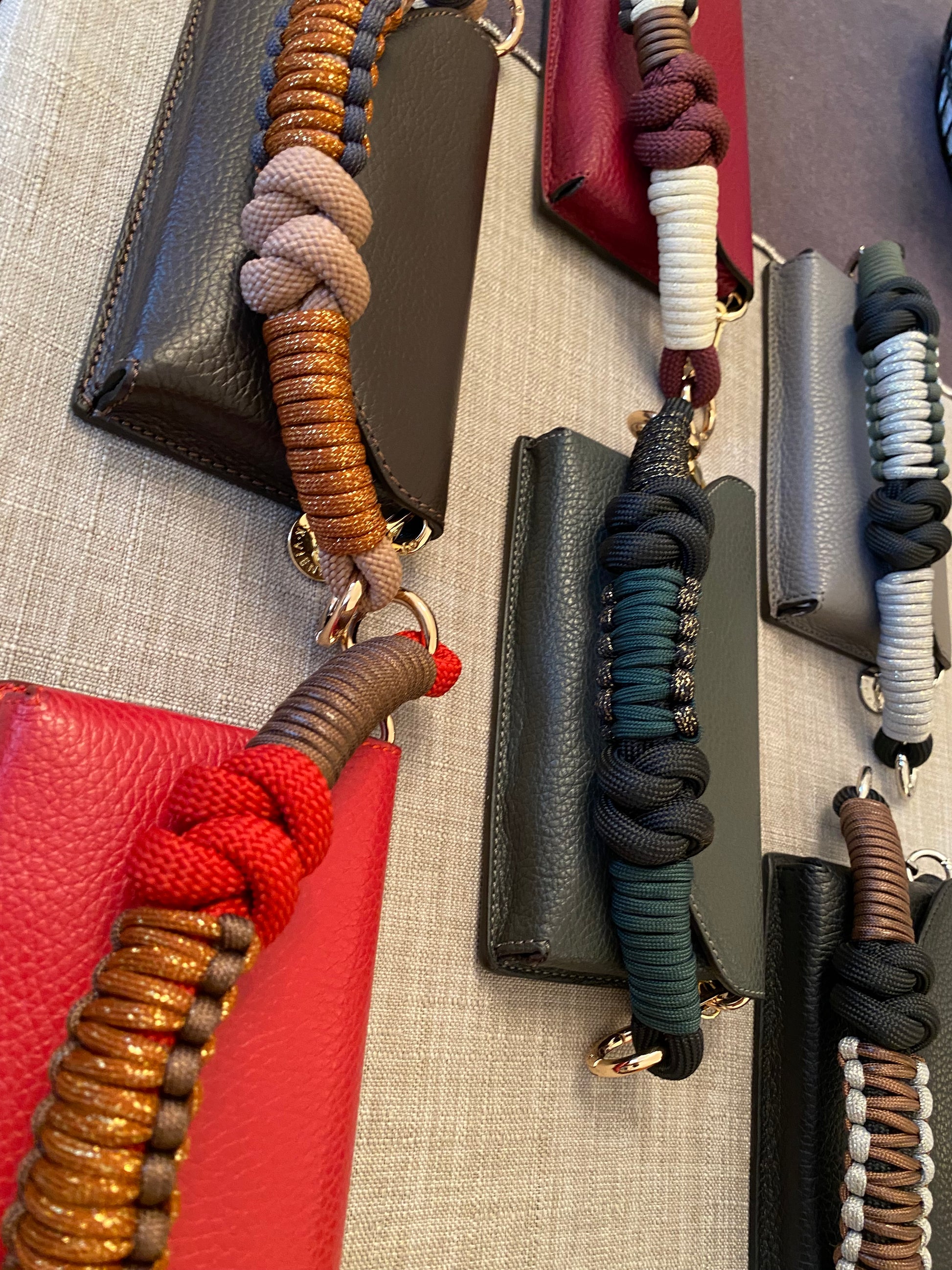 Long shoulder strap made of brass chain with eco-leather ribbon, and short handle handmade in Macrame.
